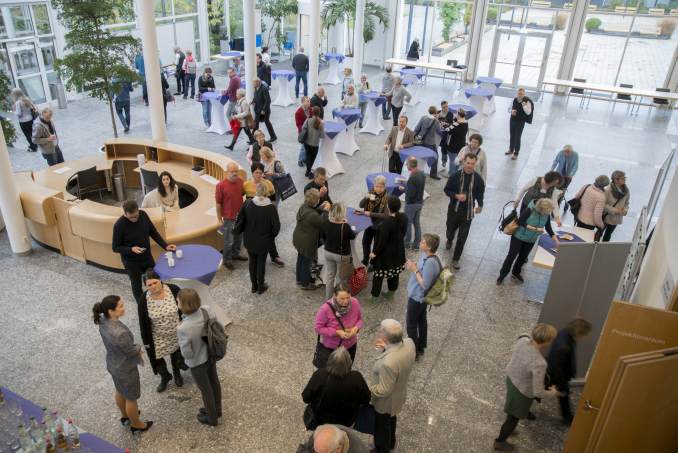 Angeregte Pausengespräche im Foyer des DKFZ beim Hautkrebs-Patiententag Heidelberg 2017